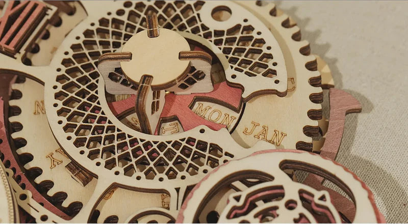 Når man drejer på knappen, lyder der et "klik" i træ, hvilket giver en mere interaktiv oplevelse mellem væguret og brugeren.