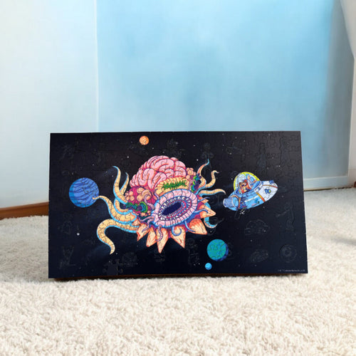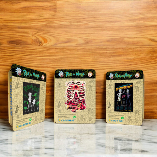 Fremstillet af førsteklasses træ og laserskåret med 0,3 mm præcision som en gal videnskabsmand, så brikkerne passer sammen med tilfredsstillende perfektion. Lavet til dem, der trives med det kaotiske og bizarre, ligesom Rick og Mortys eventyr.