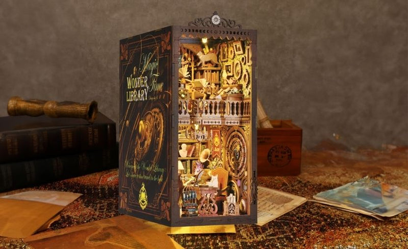 Wonder Library er designet som en klassisk hardcover og åbner op til en oplyst biblioteks scene – perfekt som pyntegenstand på en bogreol, et skrivebord eller på hjemmekontoret.