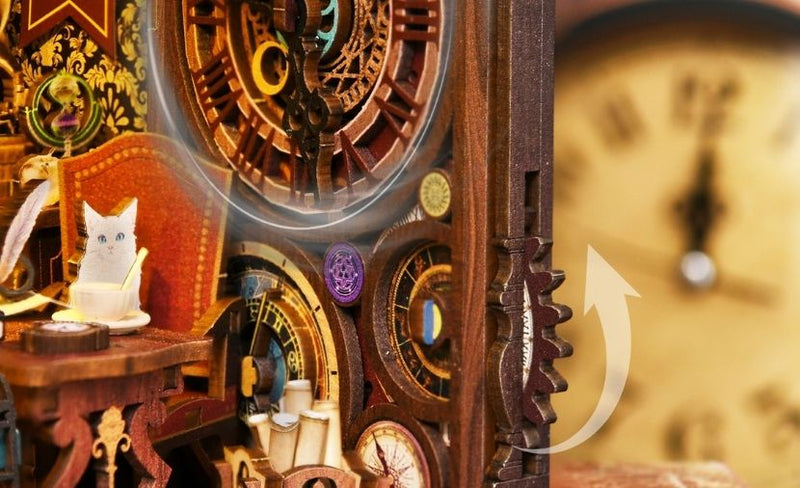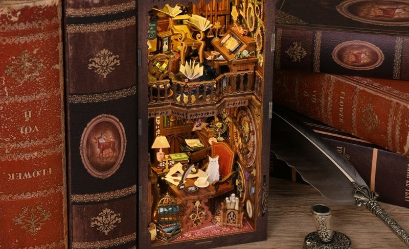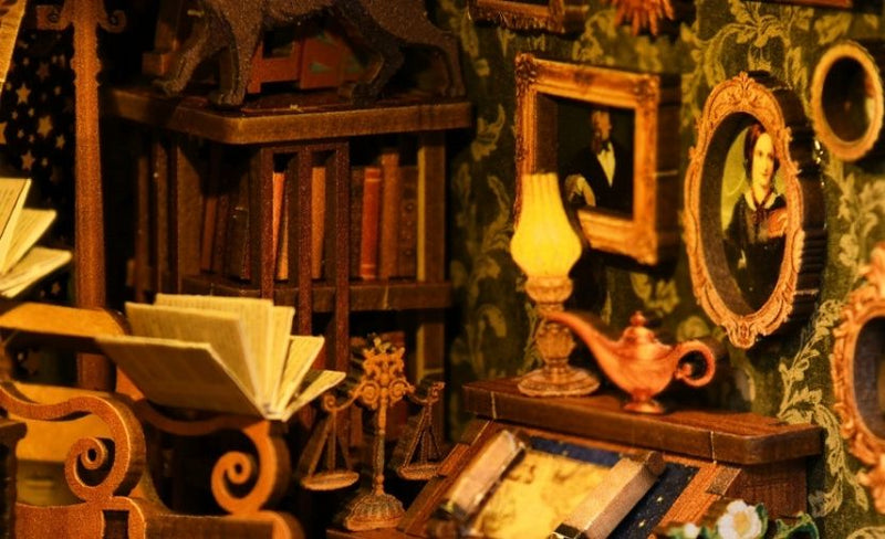 Hver bogreol, ur og lille ornament er fremstillet af præcist skåret træ, der fanger den tidløse charme ved et magisk arbejdsværelse.