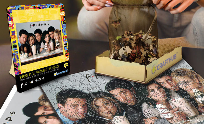 Fejr seriens charme med puslespilsbrikker formet som ikoniske figurer, Central Perk-sofaen, en kalkun, et kaffekrus og mindeværdige citater!