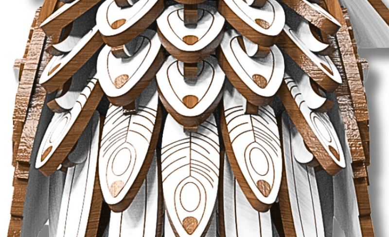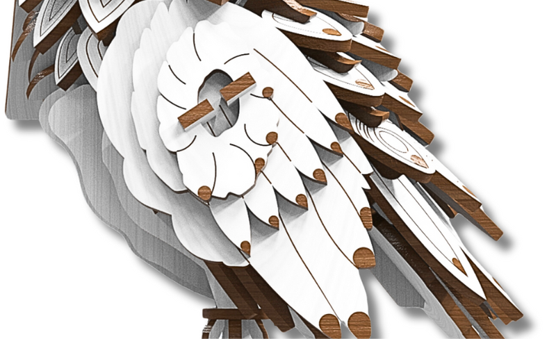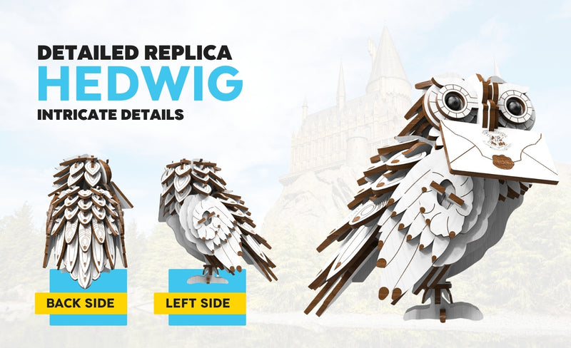 Lagdelte stykker replikerer Hedwigs fjer og tilføjer realistisk tekstur og dybde til hendes krop.