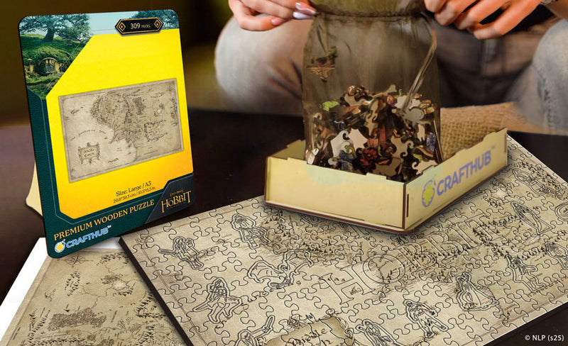 Tag på en episk rejse gennem Midgård med puslespilsbrikker formet som Bilbo, Gandalf, Gollum, dragen Smaug, Den Ene Ring og legendariske symboler fra Hobbitten.