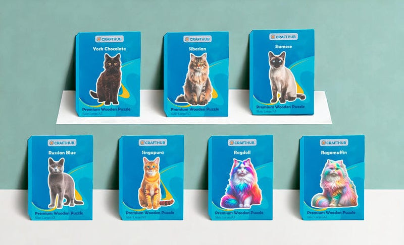 Dyk ned i en stor fejring af kattes skønhed med vores træpuslespil, der viser over 50 unikke katteracer fra hele verden.