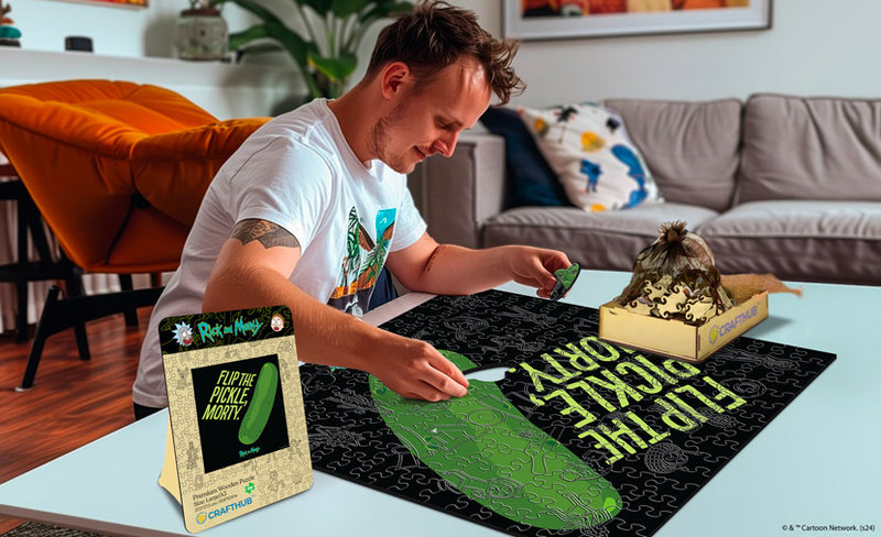 Fremstillet af førsteklasses træ og laserskåret med 0,3 mm præcision som en gal videnskabsmand, så brikkerne passer sammen med tilfredsstillende perfektion. Lavet til dem, der trives med det kaotiske og bizarre, ligesom Rick og Mortys eventyr.