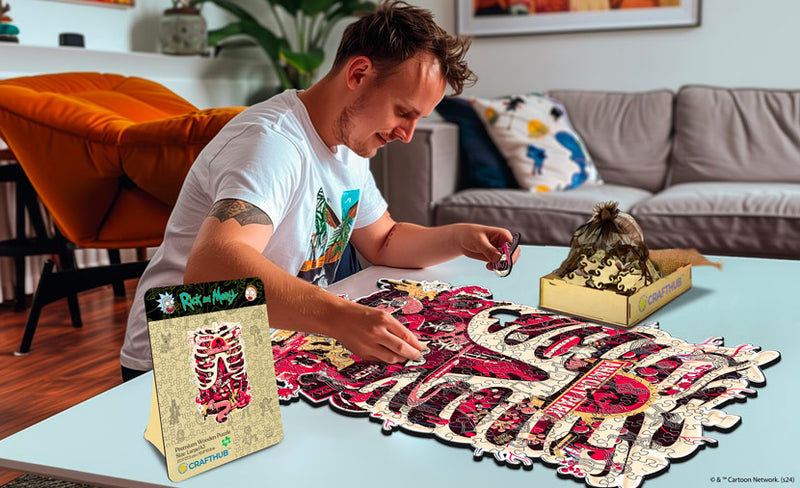 Fremstillet af førsteklasses træ og laserskåret med 0,3 mm præcision som en gal videnskabsmand, så brikkerne passer sammen med tilfredsstillende perfektion. Lavet til dem, der trives med det kaotiske og bizarre, ligesom Rick og Mortys eventyr.