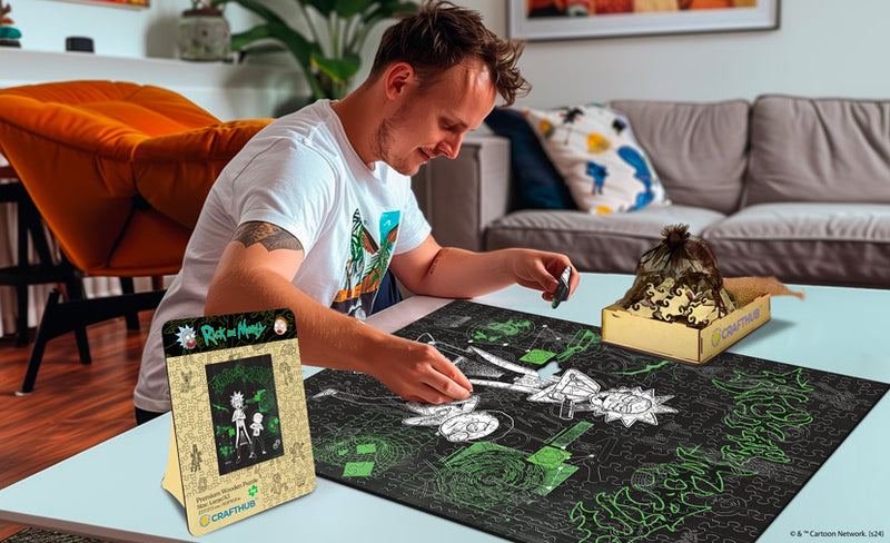Fremstillet af førsteklasses træ og laserskåret med 0,3 mm præcision som en gal videnskabsmand, så brikkerne passer sammen med tilfredsstillende perfektion. Lavet til dem, der trives med det kaotiske og bizarre, ligesom Rick og Mortys eventyr.
