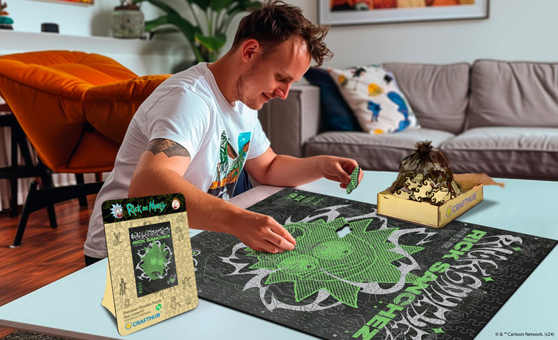 Fremstillet af førsteklasses træ og laserskåret med 0,3 mm præcision som en gal videnskabsmand, så brikkerne passer sammen med tilfredsstillende perfektion. Lavet til dem, der trives med det kaotiske og bizarre, ligesom Rick og Mortys eventyr.