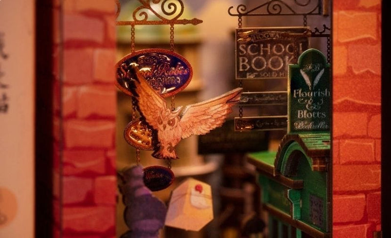 Denne book nook er designet med perfekte detaljer, fra detaljerede butiksskilte til den magiske ugle, der bærer et brev, hvilket får scenen til at føles virkelig levende.